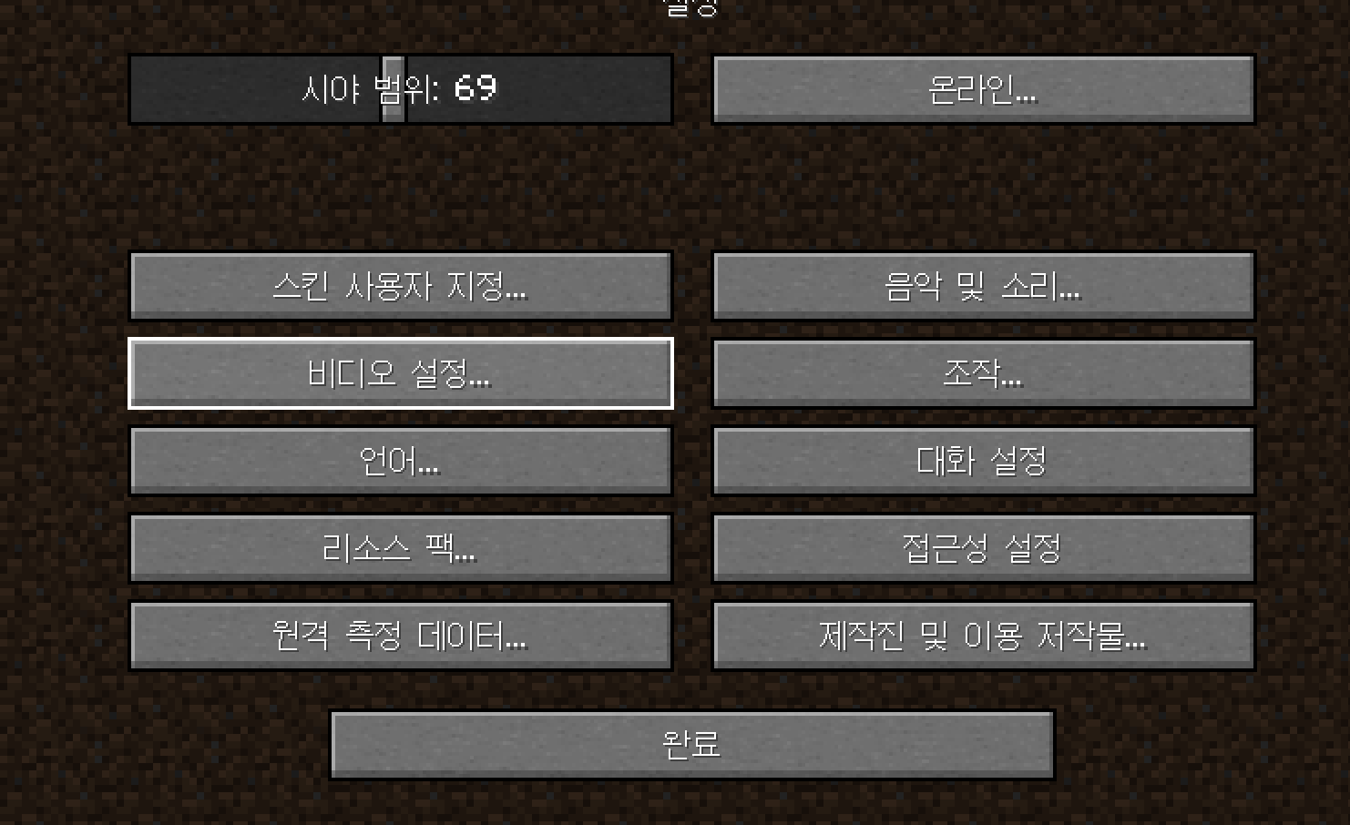 마인크래프트를 켜서 설정에 들어가 비디오 설정에 들어가줍니다